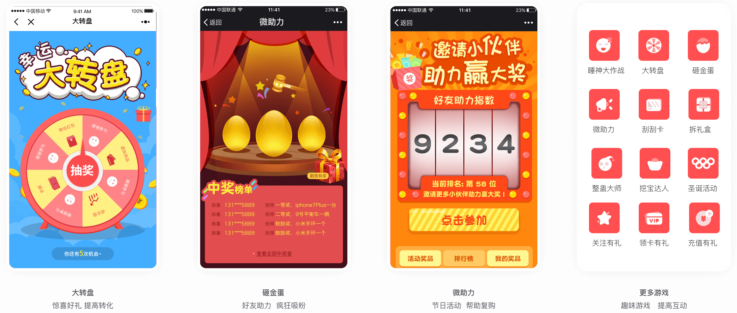 H5营销:在公众号中配置好玩的H5营销,不仅可以提升粉丝的参与感和活跃度,实现迅速圈粉的目的,还可以通过游戏赢取的优惠券、积分、礼品,提
